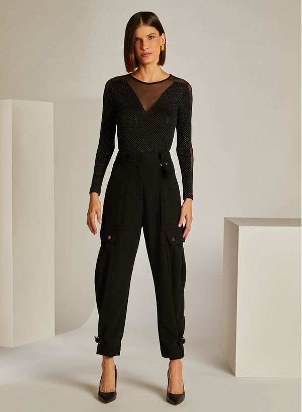 Confeccionada em malha, a Blusa possui caimento ajustado e transparência, gola redonda, mangas longas, detalhe de cristais aplicados e acabamento pespontado.