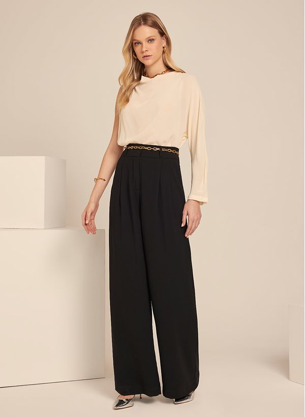 A Blusa é confeccionada em tecido fluido, possui gola redonda com detalhe drapeado, alça larga, manga longa única e acabamento pespontado.