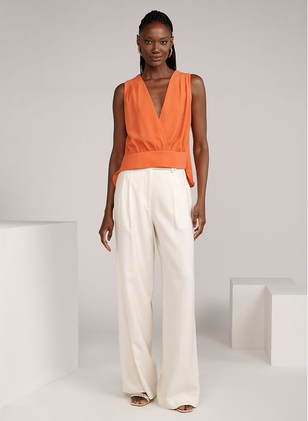 Os tons alaranjados prometem ser protagonistas na temporada, e a cor vibrante garante uma produção alegre e estilosa. Combine com calça off white e sandálias metalizadas para um visual harmônico e easy chic.