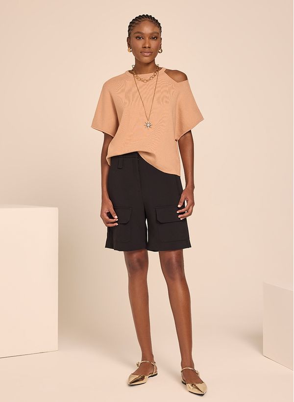 A Blusa é confeccionado em tricot, possui decote redondo, mangas curtas, recorte vazado e acabamento pespontado.