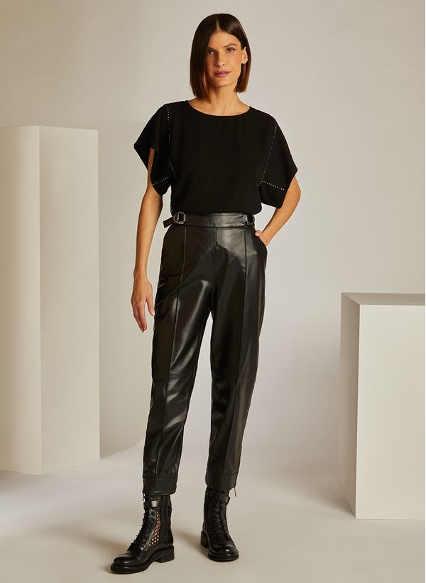 Para as amantes de aplicações de cristais, a Blusa Paty é perfeita para compor looks charmosos. Invista no look all black, combinando com uma calça de couro preta, acessórios metalizados e coturnos, para um visual urbano chic.
