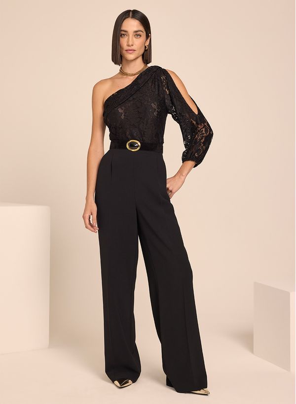 A Blusa é confeccionada em malha com renda aplicada, possui transparência, decote assimétrico, mangas longas, recorte vazado e acabamento pespontado.