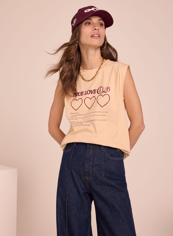 A Blusa é confeccionada em malha, possui estampa frontal localizada em glitter, gola redonda, alças largas e acabamento pespontado.
