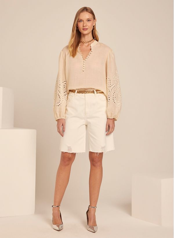 A Blusa é confeccionada em laise, possui decote "v", mangas longas bufantes, fechamento frontal por botões forrados e acabamento pespontado.