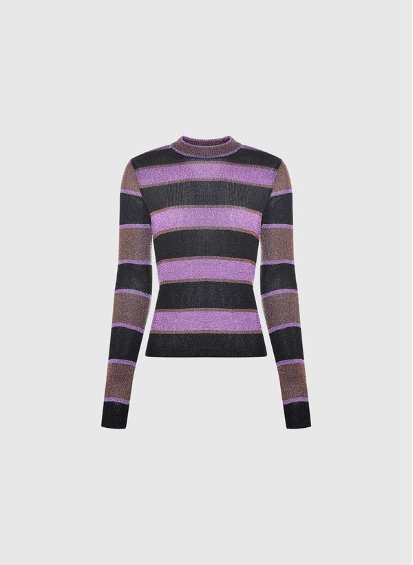Confeccionada em tricot, a Blusa possui padronagem listrada, modelagem justa, gola redonda, mangas longas, leve transparência e acabamento canelado.