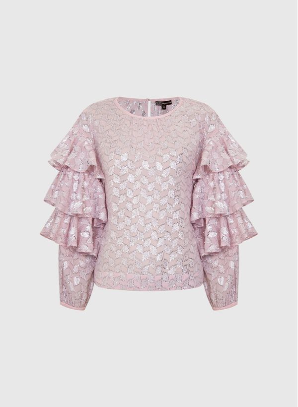 A Blusa é confeccionada em tecido plano com lurex, possui caimento reto, gola redonda, mangas longas com babados assimétricos em camadas e elástico nos punhos, fechamento posterior por botão e acabamento pespontado.