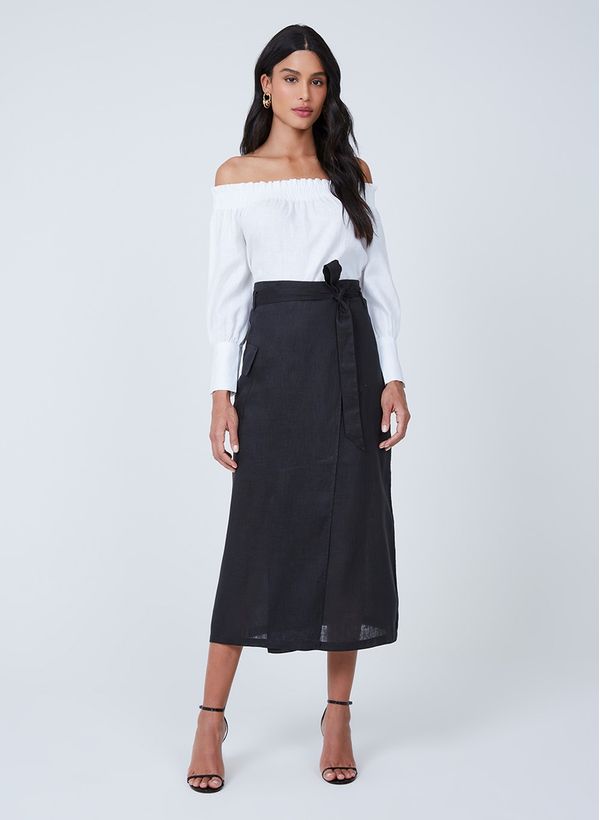 Confeccionada em linho, a blusa possui modelagem ampla, decote ombro à ombro, mangas longas e busto com detalhe elástico.