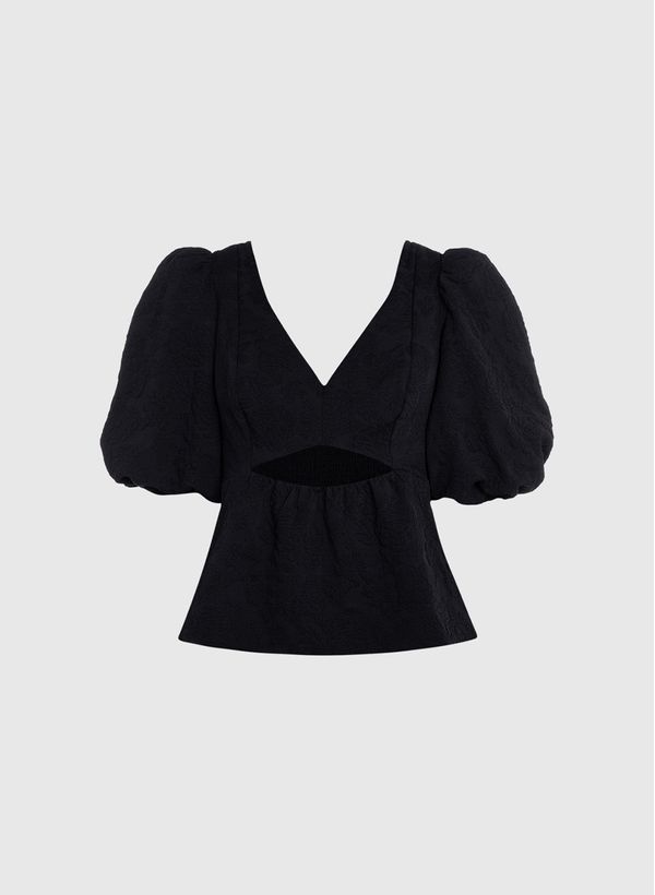 Confeccionada em tecido plano com estampa floral em alto-relevo, a Blusa possui caimento acinturado, decote em V, recorte frontal vazado, mangas curtas bufantes, pala de lastex na parte posterior, fechamento por zíper invisível lateral e acabamento pespontado.