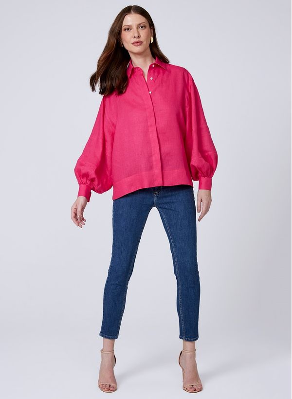 A Blusa é confeccionada em linho, possui modelagem ampla, mangas longas bufantes, colarinho de camisa, fechamento por botão na parte frontal e logo em metal na parte posterior.