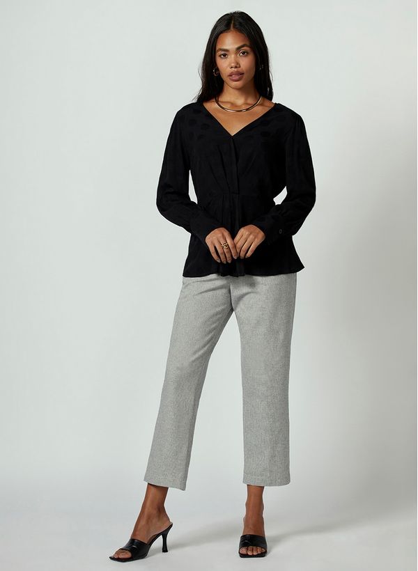 A blusa é confeccionada em tecido leve e fluído com padronagem em jacquard, possui decote V com transpasse e pregas frontais, mangas longas com detalhes franzidos e abotoamento nos punhos.
