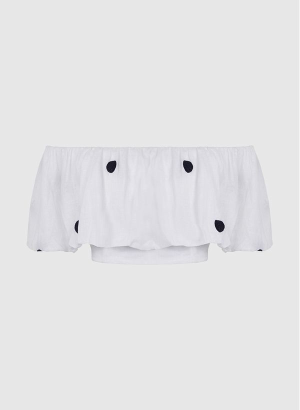 Confeccionada em linho, a Blusa possui padronagem poá em bordados, modelo ombro a ombro, mangas curtas bufantes, detalhe balonê, barra reta ajustada e acabamento pespontado.