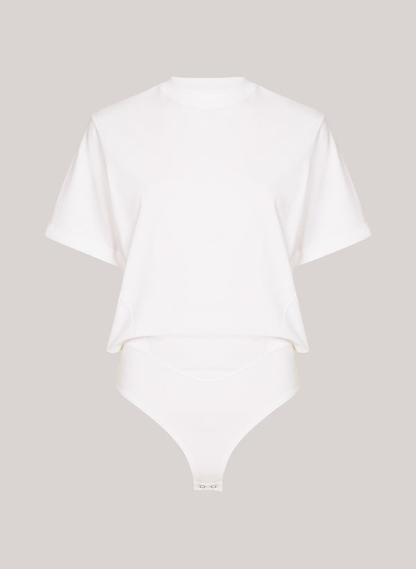 Confeccionada em malha, o Body possui modelagem ampla, gola careca, mangas curtas e acabamento pespontado.