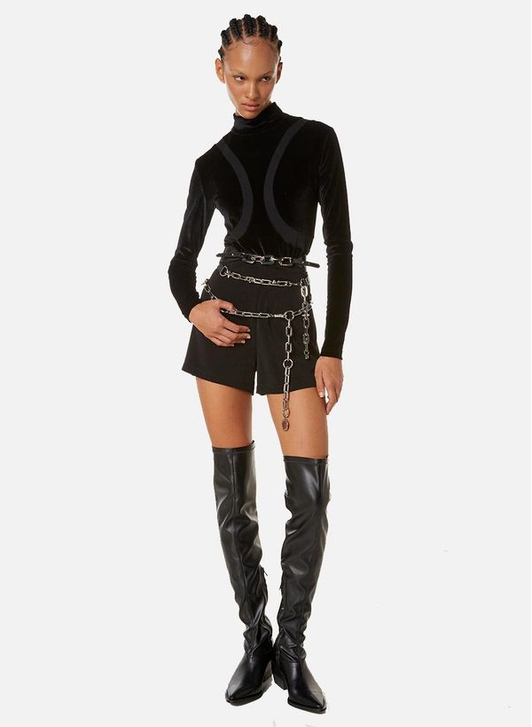 Confeccionado em malha, o Body possui modelagem justa ao corpo com gola alta e mangas longas, detalhe de recortes em tule no busto, abertura por zíper posterior e fecho por botões de pressão.