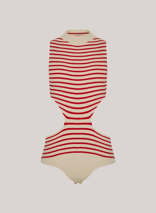 Confeccionado em tricot com padronagem listrada, o Body possui modelagem justa, gola média canelada, sem mangas, recorte na altura da cintura e costas e acabamento canelado.