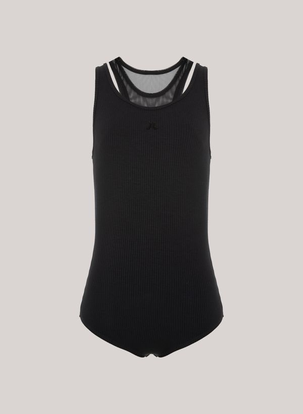 Confeccionado em malha canelada e tule, o Body possui modelagem justa, decote e alças duplas, assinatura da marca e acabamento canelado.