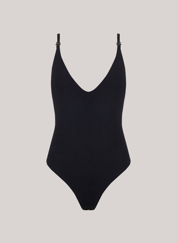 glitter em toda a peça, alças finas com detalhe de passante personalizado, decote profundo posterior e acabamento pespontado.