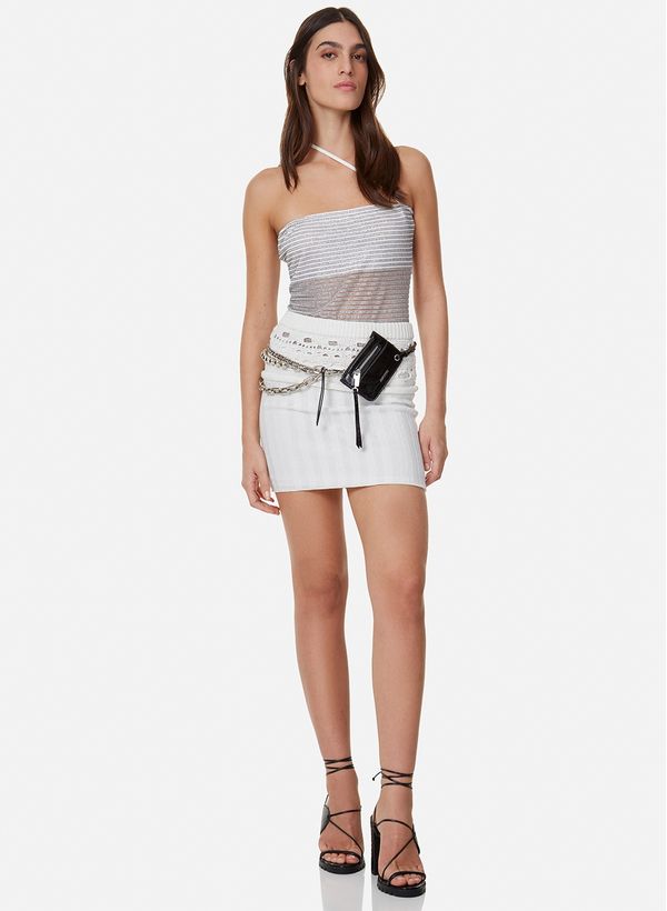 Confeccionada em malha devorada com pinos de glitter, o Body possui modelagem ajustada ao corpo, decote reto, alça única de espessura fina, fechamento posterior por zíper invisível e inferior por botão de pressão.