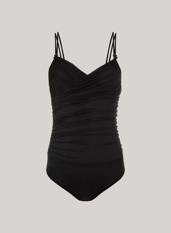 justa , decote em ""V"", alças duplas com regulador e aviamento do logo personalizado em onix, detalhe frontal transpassado e acabamento pespontado.