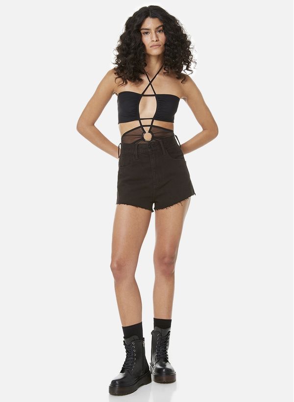 Confeccionado em malha, o Body possui modelagem justa ao corpo, recortes vazados com acabamento em elástico, alças únicas, detalhe de argola frontal, franzido e transparência inferior.