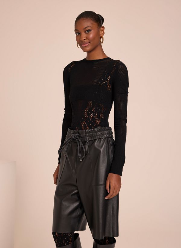 Confeccionado em malha rendada, o Body possui modelagem justa, gola arredondada, mangas longas e fechamento por botões.