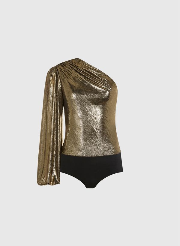 O Body é confeccionado em malha metalizada, possui modelo um ombro só, decote assimétrico, detalhe drapeado com manga longa bufante, fechamento lateral por zíper, forro interno e acabamento pespontado.
