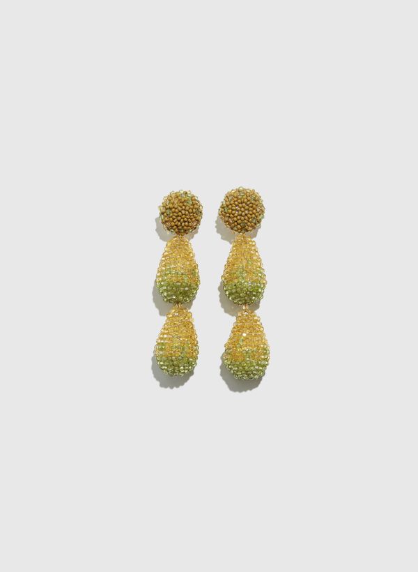 O Brinco é fabricado em acrílico com mini miçangas aplicadas, possui formato de três esferas pendentes, comprimento alongado e fechamento posterior por tarraxa.