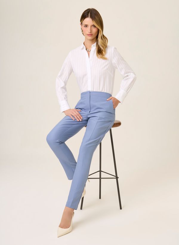 ajustado , cintura alta com cós largo e estruturado, elástico embutido na parte posterior, bolsos e fechamento frontal interno.