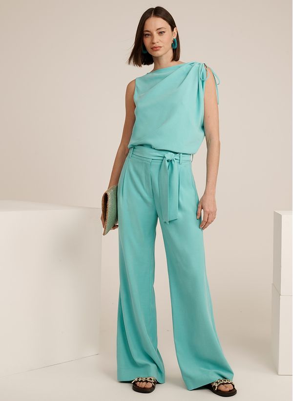 A Calça é confeccionada em tecido leve e fluido, possui modelagens pantalona e alfaiataria, cós com passantes e faixa, pregas e bolsos frontais, bolsos posteriores embutidos. Peça acompanha faixa de mesmo tecido para amarração.