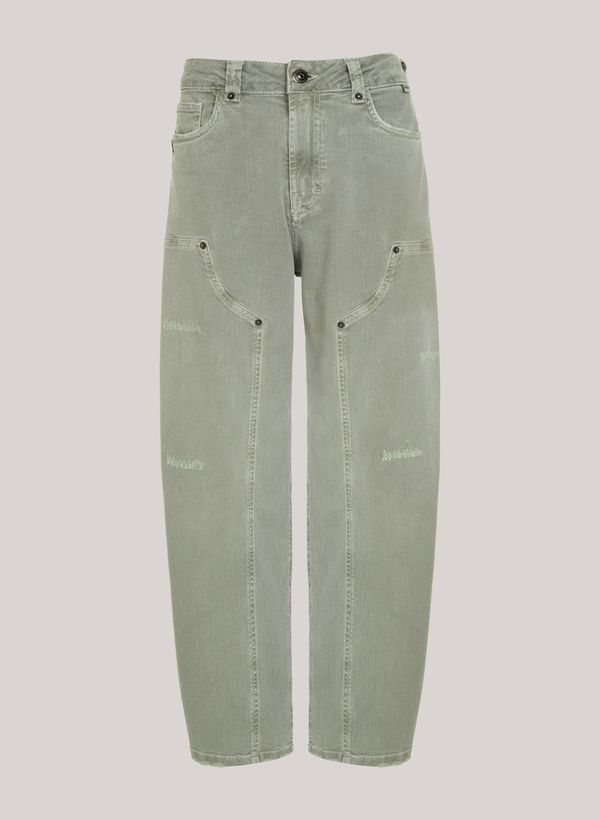 Confeccionada em sarja, a Calça possui modelagem balloon, cós com passantes, bolsos frontais e posteriores, fechamento frontal por zíper e botão, recortes em pesponto com tachas metalizadas, etiqueta externa aplicada e acabamento pespontado.