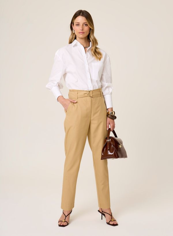 Confeccionada em tecido plano, a Calça possui modelagem Cenoura, com corte ajustado na cintura e nos quadris, afunilando gradualmente até o tornozelo, cós com passantes e cinto, cintura alta, bolsos, fechamento frontal e acabamento pespontado.