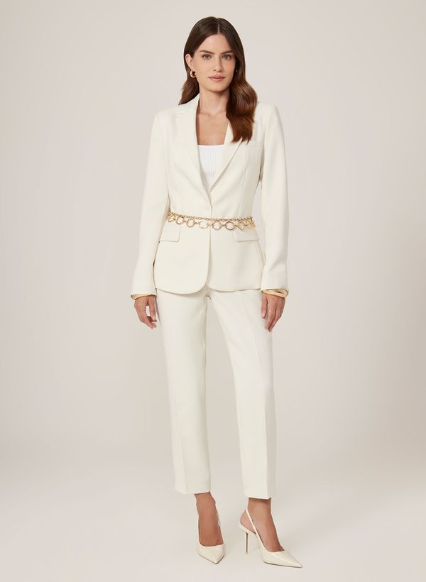 Alfaiataria, cós alfaiatado, cintura média, barra reta levemente ajustada e fechamento frontal.