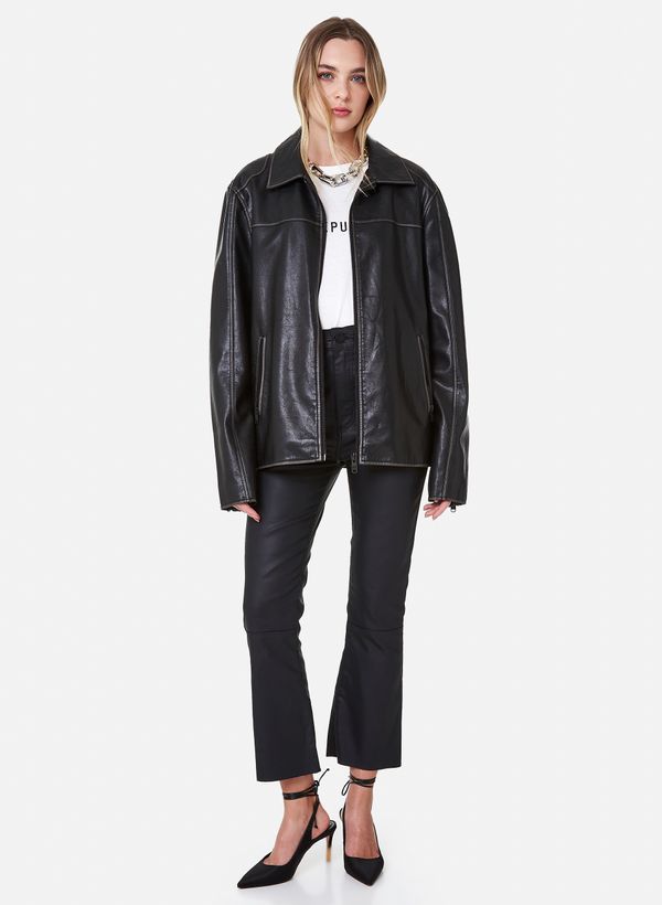 Confeccionada em sarja, a Calça possui modelagem cool girl, bolsos frontais e posteriores, acabamento pespontado e fechamento por botão e zíper frontal.