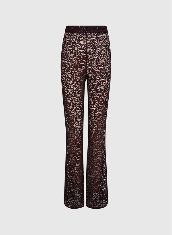 A Calça é confeccionada em renda com fios metálicos, possui modelagem flare, transparência, cós aplicado, fechamento lateral por zíper invisível e acabamento pespontado.