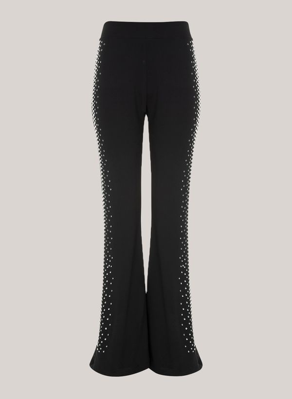 Confeccionada em malha, a Calça possui modelagem flare , cós alto, aplicações de taxas metalizadas nas laterais e acabamento pespontado.