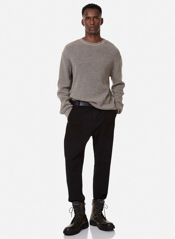 Confeccionada em sarja, a Calça possui modelagem Hype, recortes, dois bolsos frontais e posteriores, ferragens em preto fosco e fechamento por botão e zíper no cós.