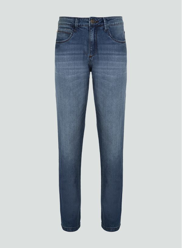 Confeccionada em jeans, a Calça possui modelagem Concept, cós com passantes, dois bolsos frontais, dois bolsos posteriores com detalhe, fechamento frontal por zíper e botão e acabamento pespontado.