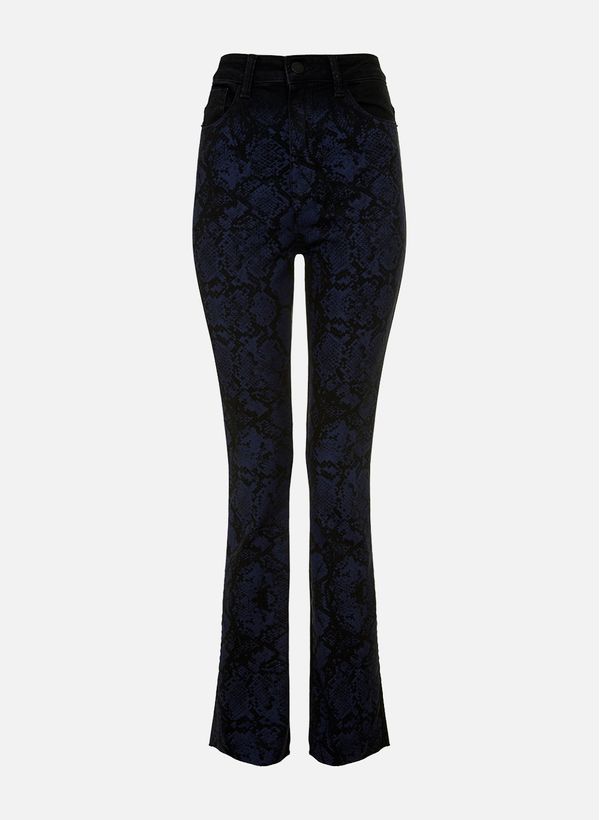 Confeccionada em jeans com estampa, a Calça possui modelagem cool girl, cós com passantes, bolsos frontais e posteriores, fechamento frontal por zíper e botão e acabamento pespontado.