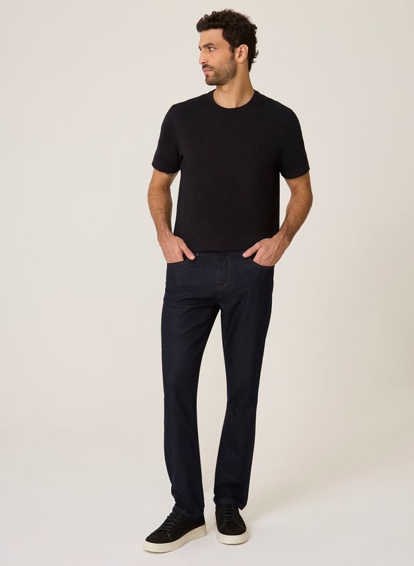 A Calça é confeccionada em jeans com lavagem escura, possui modelagem Concept com cintura baixa e caimento reto, cós com passantes, fechamento frontal por zíper e botão, cinco bolsos e acabamento em pespontos contrastantes.