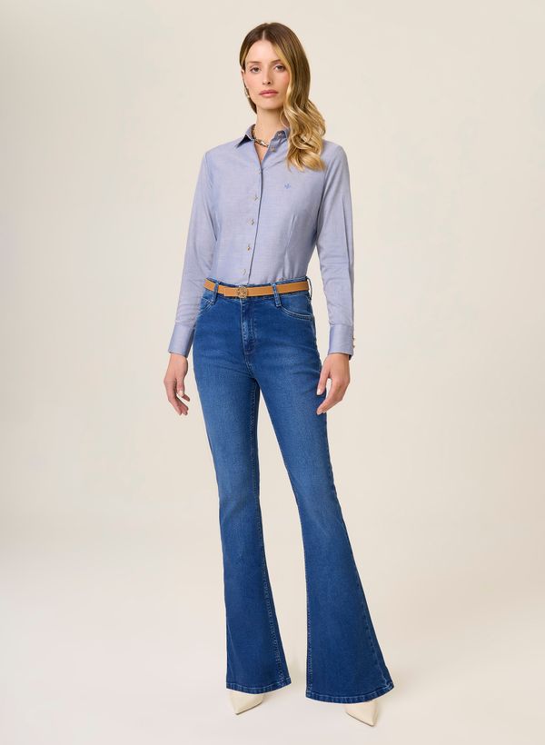 Confeccionada em jeans, a Calça possui modelagem Flare, mais ajustada até o joelho abrindo em direção à barra, cós com passantes, cintura média, bolsos, fechamento frontal e acabamento pespontado.