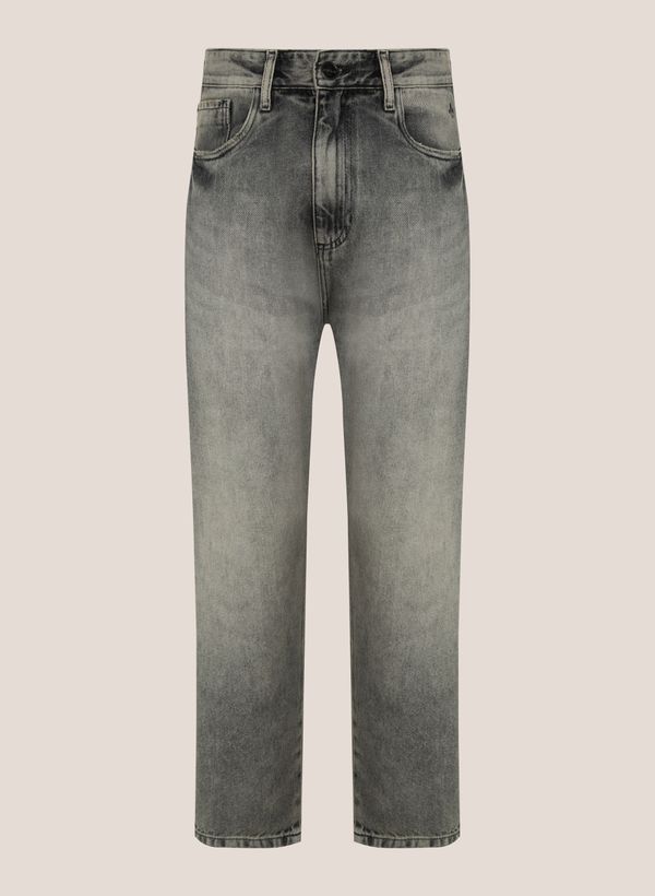 Confeccionado em Jeans com lavagem estonada, a calça possui modelagem levemente ampla, cós com passante para cintos, bolsos frontais e posteriores, etiqueta externa, fechamento por zíper e botão e acabamento pespontado.