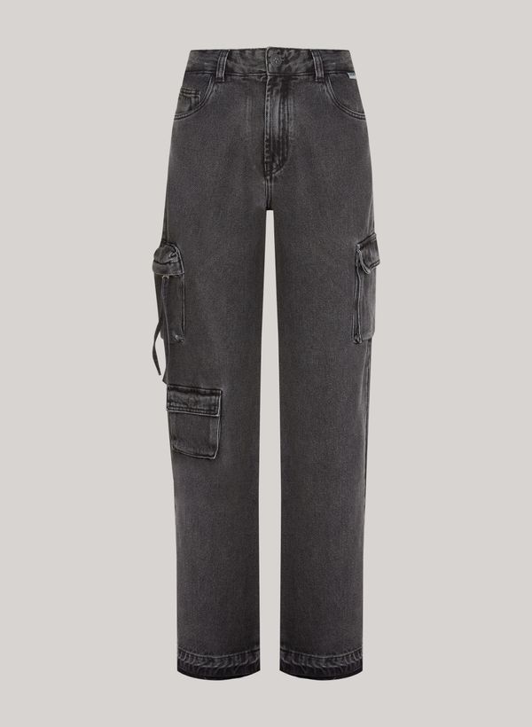 new wide, cós com passantes, bolsos frontais, bolsos laterais tipo cargo e bolsos posteriores, fechamento frontal por zíper e botão, etiqueta externa aplicada e acabamento pespontado.
