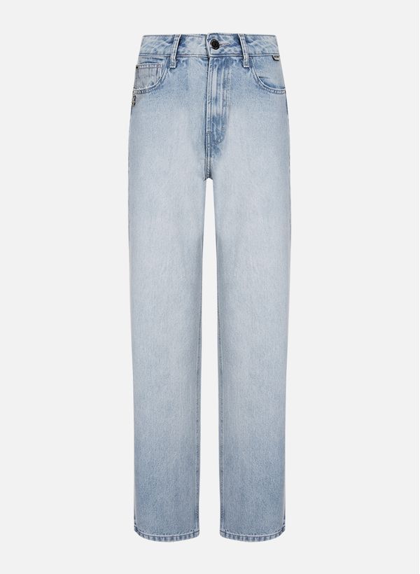 Confeccionada em jeans, a Calça possui modelagem new wide, cós com passantes, cinco bolsos, hot fix aplicados no bolso posterior, fechamento frontal por zíper e botão, etiqueta externa aplicada e acabamento pespontado.