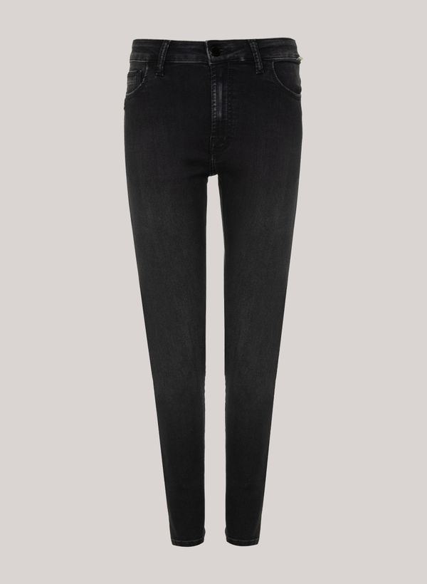 Confeccionada em jeans, a Calça possui modelagem pfit skinny, cós com passantes, cinco bolsos, fechamento frontal por zíper e botão, etiqueta externa aplicada e acabamento pespontado.