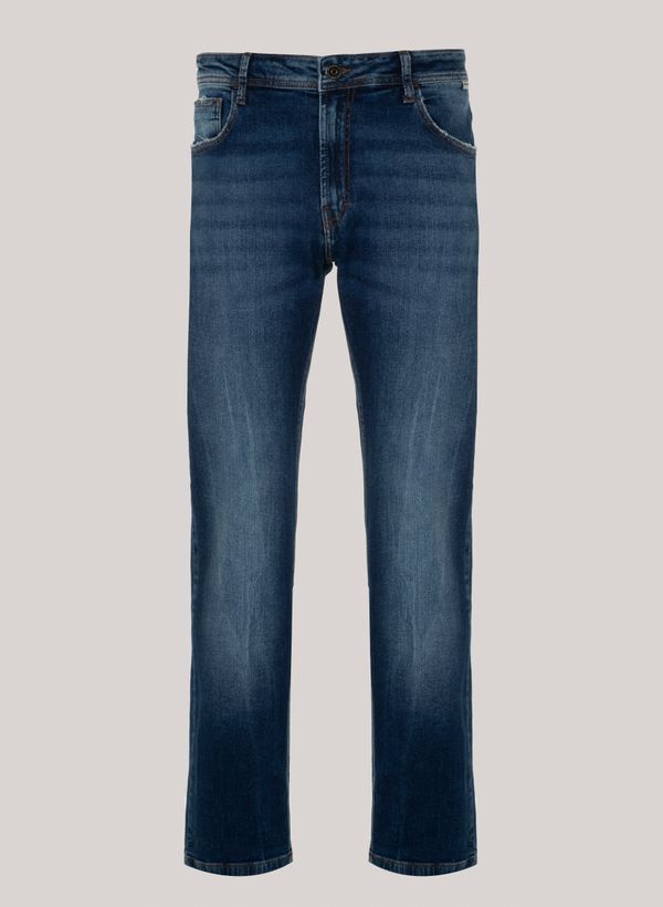 Confeccionada em jeans, a Calça possui modelagem regular fit, cós com passantes, cinco bolsos, fechamento frontal por zíper e botão, bordado posterior, etiqueta externa aplicada e acabamento pespontado.