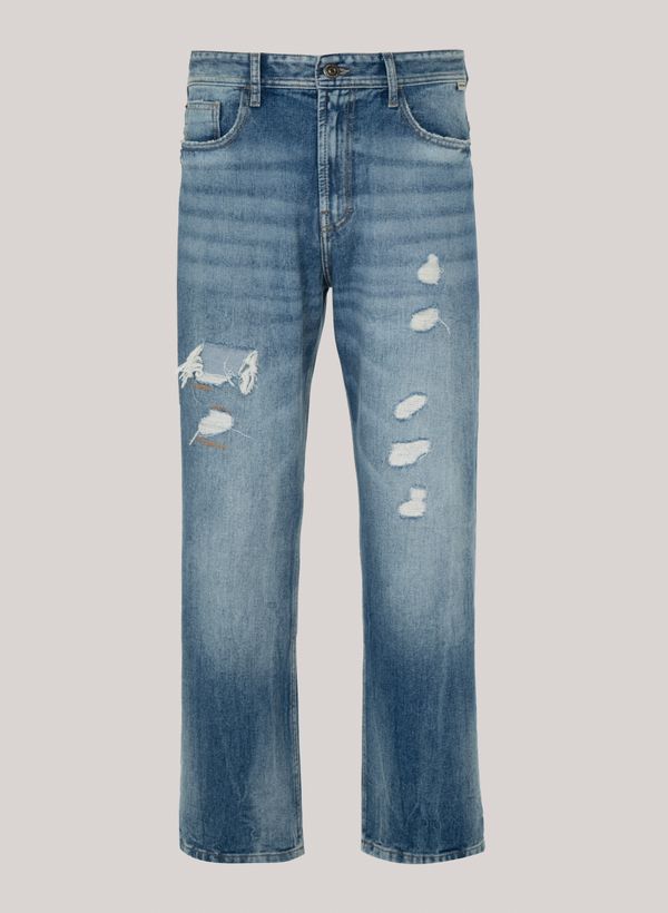 Confeccionada em jeans, a Calça possui modelagem relaxed fit, cós com passantes, bolsos frontais e posteriores, fechamento frontal por zíper e botão, detalhe em rasgos, etiqueta externa aplicada e acabamento pespontado.