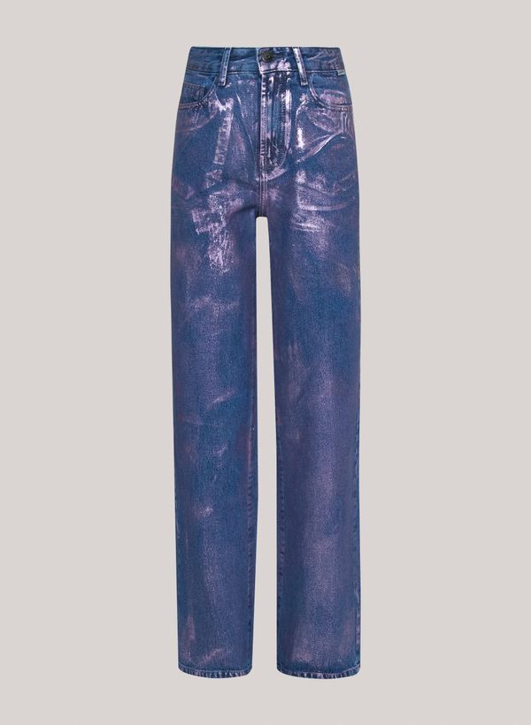 Confeccionada em jeans com foil metalizado corrido por toda a peça, a Calça possui modelagem relaxed fit, cós com passantes, bolsos frontais e posteriores, fechamento frontal por zíper e botão, etiqueta externa aplicada e acabamento pespontado.