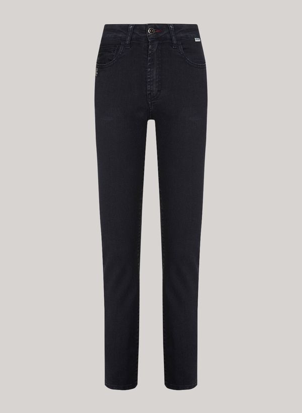 Confeccionada em jeans, a Calça possui modelagem skinny, cós com passantes, cinco bolsos, fechamento frontal por zíper e botão, etiqueta externa aplicada e acabamento pespontado.