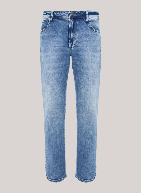 Confeccionada em jeans, a Calça possui modelagem slim fit, cós com passantes, cinco bolsos, fechamento frontal por zíper e botão, etiqueta externa aplicada e acabamento pespontado.