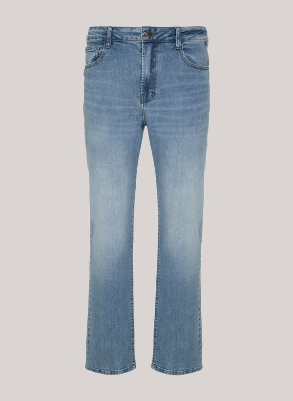 Confeccionada em jeans, a Calça possui modelagem slim fit, cós com passantes, bolsos frontais e posteriores, fechamento frontal por zíper e botão, etiqueta externa aplicada e acabamento pespontado.