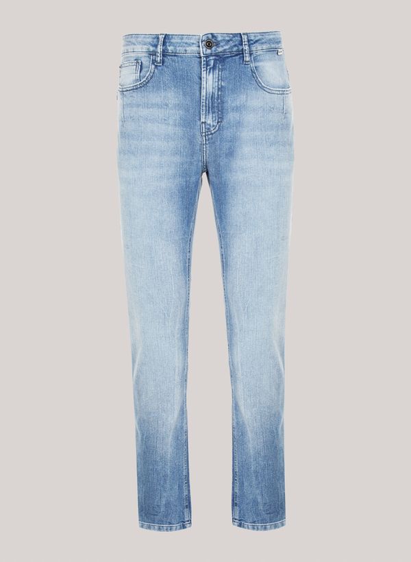 Confeccionada em jeans, a Calça possui modelagem slim fit, cós com passantes, cinco bolsos, fechamento frontal por zíper e botão, etiqueta externa aplicada e acabamento pespontado.